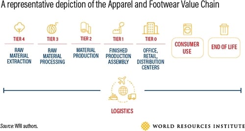 However, the largest source of emissions for most apparel and footwear brands is the supply chain. Often described in tiers, the supply chain includes every stage between the extraction of raw materials (like cotton, leather and polyester) to when the finished product is assembled. This means that to truly make a dent in their carbon footprint, brands must look at supplier activities in tiers 1-4.