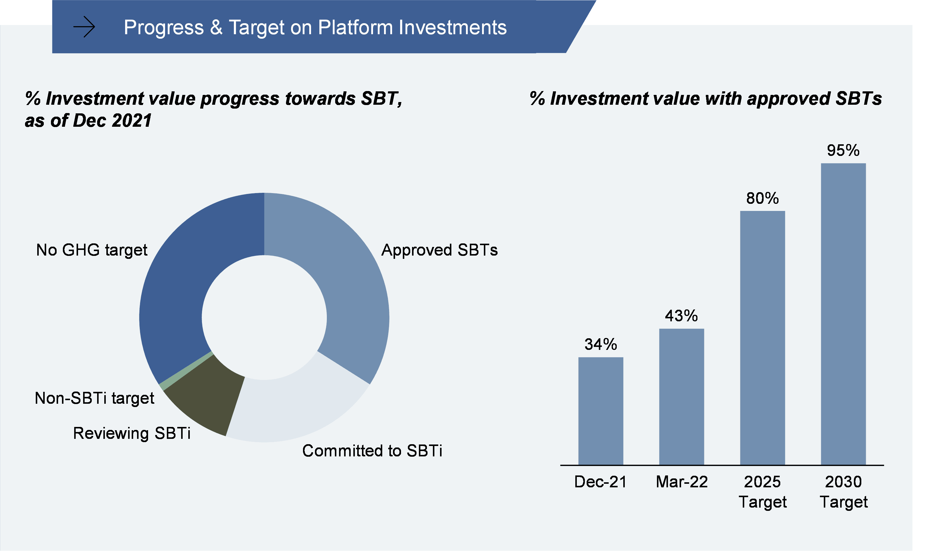We were one of the first investment firms globally to engage in setting science-based targets in 2021 as part of the original pilot of the SBTi’s Financial Framework. Our 1.5°C-aligned target was submitted in October 2021, approved in January 2022, and officially announced in March 2022. We have committed to reducing absolute Scope 1 and 2 GHG emissions by 46% in 2030 from a 2020 base year. Our Scope 3 portfolio target covers 99% of total investment activities as of 2021. We have also committed that 80% of our portfolio investments (by invested capital at fair value) will have set SBTi-validated targets by 2025, increasing to 95% by 2030. We are proud to say that this is one of the most ambitious science-based targets in the investment community to date.