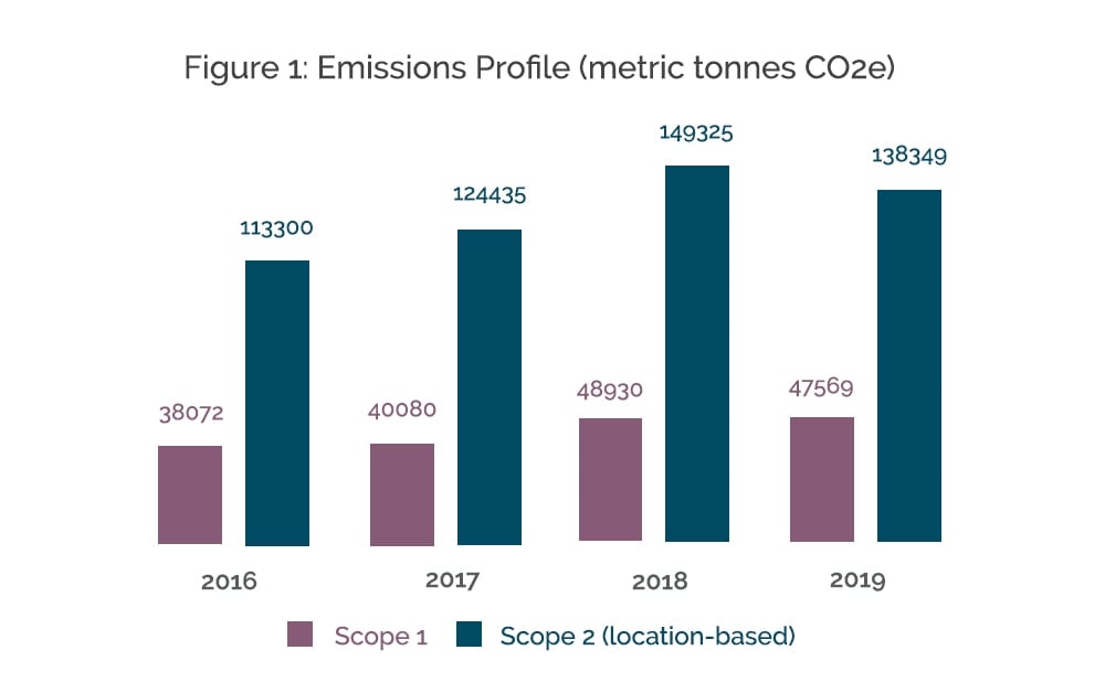 Approximately 20% of Mahindra Sanyo’s total spend is on energy. To reduce its Scope 1 and 2 emissions, the company has invested in energy efficient processes such as: revamping furnaces; reducing cycle times for ladle furnaces; implementing more efficient electric-arc and oxyfuel technologies in furnaces; improving pumps; installing a 6 MW waste heat recovery boiler and new burners for preheating ladles; and switching from oil to natural gas in all furnaces by 2020. The company has made energy efficiency improvements in its buildings by installing low carbon lighting and motion sensors. Between 2018 to 2019, Mahindra Sanyo successfully reduced its Scope 1 and Scope 2 emissions by 6% (Figure 1).