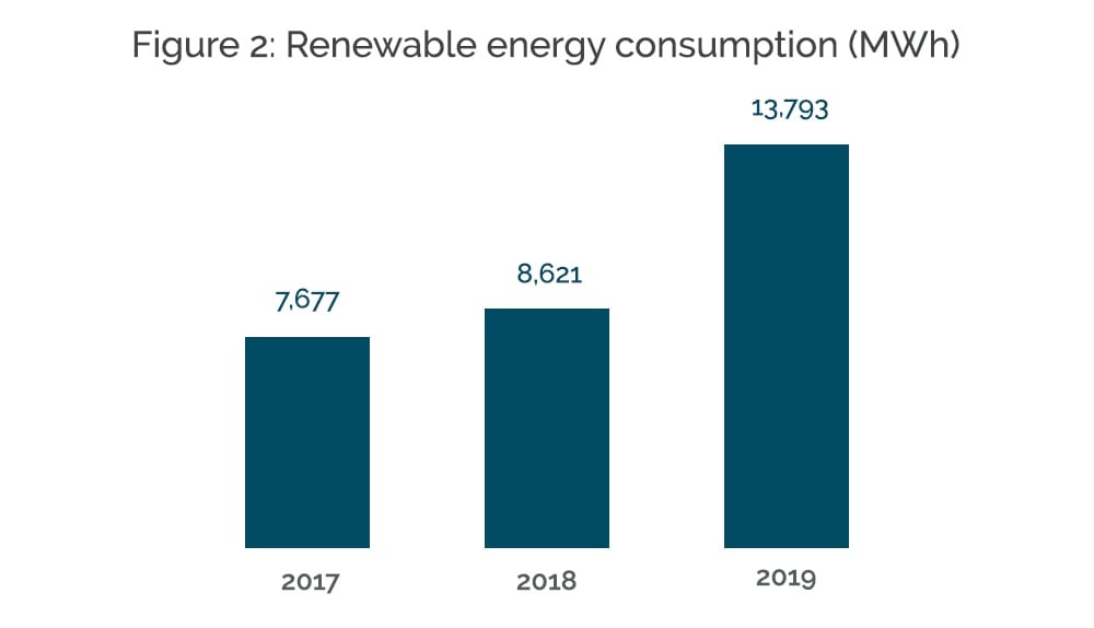 Between 2017 to 18, the company reduced its electricity consumption by 2%, and met 4% of its power requirements through renewable sources. This was helped by the installation of a new 4 MW solar plant and an 80% increase in renewable energy procurement through power purchase agreements from 2017 to 2019 (Figure 2). Mahindra Sanyo has a five-year rolling roadmap to increase its share of renewable energy in electricity consumption. It aims to consume 32% of its total power from renewable energy sources by 2022, either through internal solar plants or renewable energy procurement.